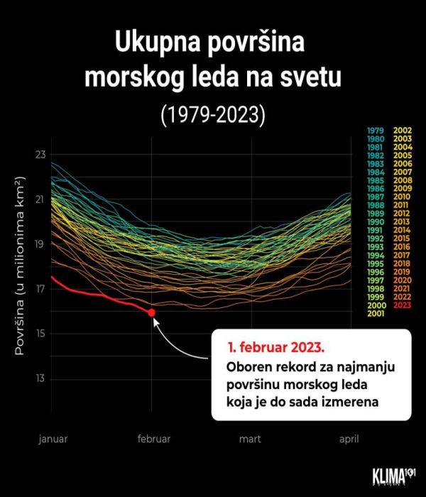 На почетокот на февруари вкупната површина на морскиот мраз, на Арктикот и на Антарктикот, падна на 15,94 милиони квадратни метри, што е најниско ниво од почетокот на водење евиденција во 1979 година, покажуваат сателитските податоци.