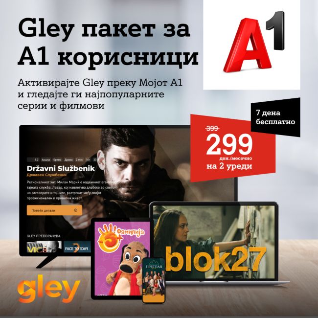 А1 Македонија со задоволство ја најавува најновата соработка со првата македонска национална видео стриминг-платформа Gley и ја информира јавноста дека отвора уште една можност за своите корисници да пристапат до богат избор на домашни, регионални и светски филмови и серии на едно место, сите преведени на македонски и албански јазик.