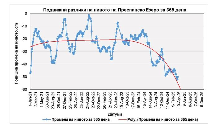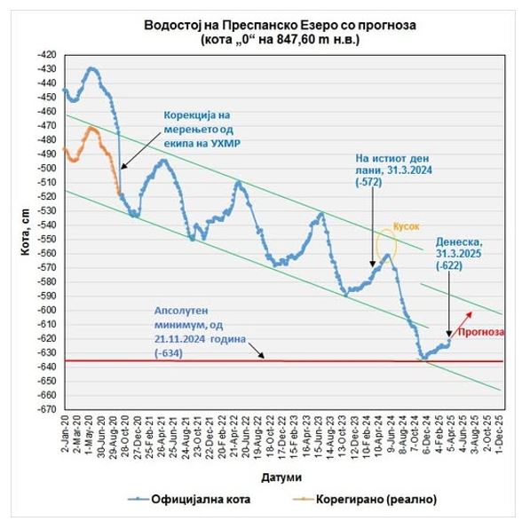 - Минатата година бевме загрижени за слабиот пролетен прилив на вода во Преспанско Езеро, но годинава е уште полоша. Ако лани бележевме зголемување на нивото за 20 cm од зимскиот минимум, годинава забележуваме одвај 12 cm и покрај секојдневните дождови. Приказната се повторува, снежните врнежи зимава беа слаби, топењето и дотокот на вода исто така пролетва се слаби, како и пролетните врнежи. Прогнозите за годинешниот максимум се движат околу кота -600 cm (сл. 1), што значи дека најверојатно нема да биде достигната горната зелена линија на трендот, слично како и лани. Така, годинешниов максимум нема да го достигне ни минимумот од декември 2023 година на кота -590 cm, што би се очекувало во колку-толку нормална година. Тогаш нормално би било да се искачи 20-ина cm над тоа ниво. Намалувањето на нивото во однос на нивото од една година претходно (сл. 2) упорно изнесува околу 50 cm, па дури и 52 cm, што одговара на неповратна годишна загуба на вода од околу 125 милиони кубни метри, односно 2,5 пати повеќе од 60-годишниот просек на намалување. Главна причина за намалување на нивото е намаленото количество врнежи поради климатските промени, во комбинација со користењето на езерските води за наводнување во трите земји, за што нема прецизни податоци. Одливот на вода низ карстот на Галичица останува приближно константен со текот на времето - вели Трајковски.