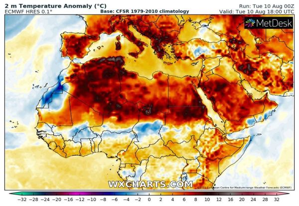 Застрашувачки топлотен бран се шири од Северна Африка кон југот на Европа, напиша синоќа на „Твитер“ шкотскиот метеоролог Скот Данкан.