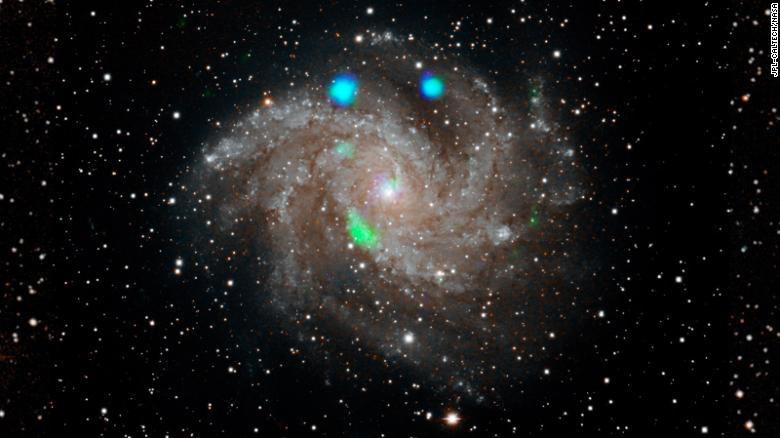Научниците на НАСА забележале моќни х-зраци во далечната галаксија, прикажани на фотографијата со сина и зелена боја. Тие сè уште не знаат од каде и зошто доаѓаат.