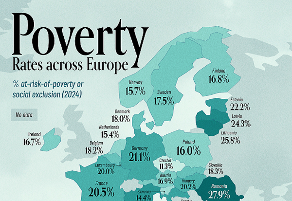 Иако Европа е еден од најбогатите региони во светот, стандардот на живеење и понатаму значително варира меѓу земјите. Мапата ја прикажува стапката на сиромаштија во 2024 година, односно процентот на лица изложени на ризик од сиромаштија или социјална исклученост во секоја земја. Податоците се од „Евростат“.