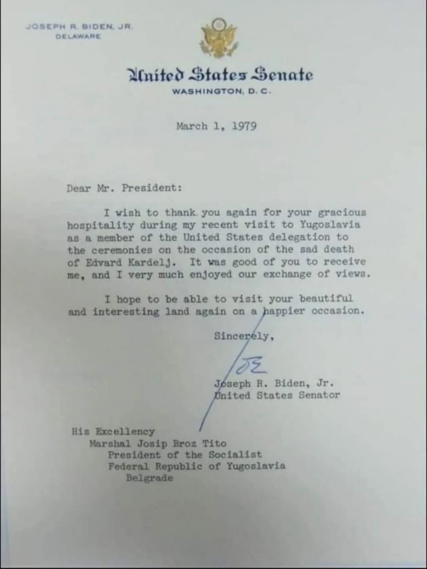 Постојат многу приказни за Бајден на погребот на Кардељ, а на социјалните мрежи кружи и писмо напишано на официјалниот меморандум на Сенатот во кое тој му се заблагодарува на Јосип Броз Тито за гостопримството што го уживал како член на американската делегација за време на погребот на Кардељ.