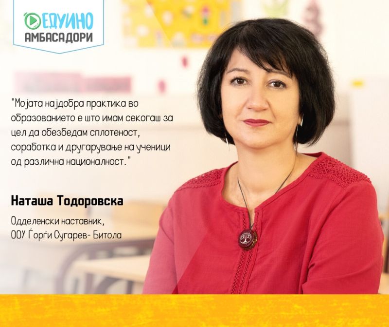 Сите ученици ги вклучувам во сѐ. Не издвојувам деца на приредба. Ќе изберам точка со активност во која секое дете ќе се пронајде, секое дете ќе има дел од драматизација, песна, водителство, без разлика дали знае да чита солидно или дали е со петки или со тројки. Нема фаворизирање, вели Наташа