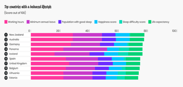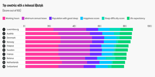 Ако ве интересира кои народи успеваат најдобро да воспостават рамнотежа меѓу работата и слободното време, погледнете ги резултатите од новото истражување. Параметрите што биле земени предвид за рангирање на земјите вклучуваат просечен број на работни часа неделно, должина на годишен одмор, процент на жители кои имаат непречен сон во текот на ноќта, должината на животниот век и чувството на среќа кај испитаниците во секоја земја што била опфатена во Индексот за животен стил на компанијата „Слип Џанкис“.