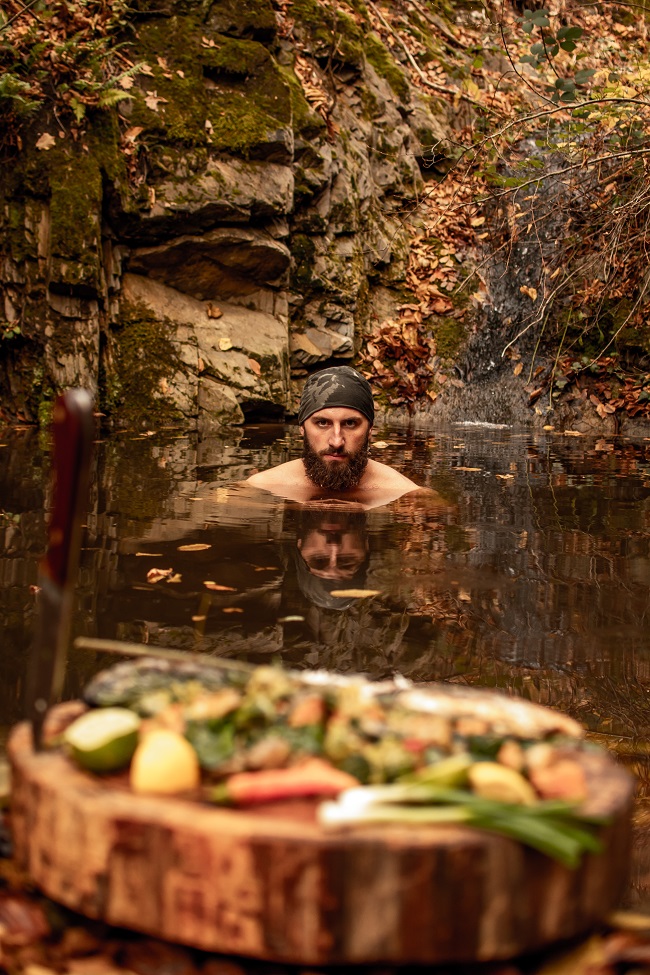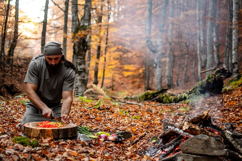 На терен покрај мене е и мојот снимател. Најчесто сме во тој состав. Покрај намирниците, кога готвам, гледам максимално да ја искористам природата. Се трудам да употребувам што е можно помалку садови за готвење кои ги имаме дома и наместо нив, сакам да го искористам она што ми го нуди природата. Така, на пример, правам сукало од делкано дрво, како рамна површина користам трупец, за маталка користам врзани гранчиња, вода користам од блиска река или извор - изјавува модерниот номад.