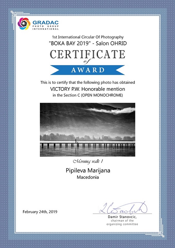 - Најчесто учествувам на интернет-конкурси каде што се аплицира дигитално. Последната награда е од 2019 година за учество во Boka Bay 2019, каде што добив почесна диплома за црно-бела фотографија, која ми е една од омилените категории.