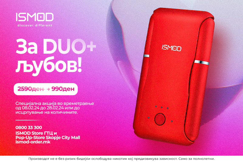 Најновата технологија на уреди за загревање на патрони, ве носи на друго ниво со нова супер понуда. Започнувајќи од денес , 8 па до 28 февруари, ISMOD II PLUS / ISMOD DUO + најуникатниот модел со можност за делење на сесијата на консумирање на полнолетни лица со друго лице доаѓа со намалена цена.
