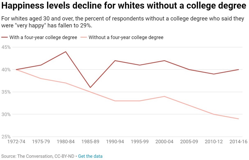 Нивото на среќата опаѓа за белците без диплома од колеџ