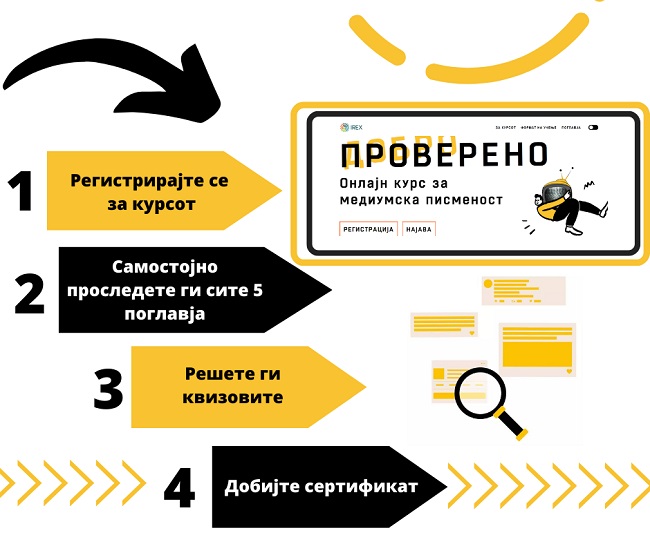 Добро проверено е единствениот целосно бесплатен интерактивен онлајн курс за медиумска писменост кај нас, па откако ќе го завршите, добивате сертификат.