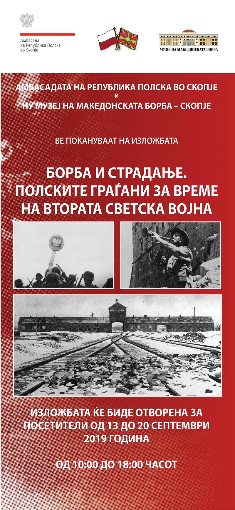 Амбасадата на Република Полска во Скопје и НУ Музеј на македонската борба - Скопје имаат чест да Ве поканат на изложбата БОРБА И СТРАДАЊЕ. ПОЛСКИТЕ ГРАЃАНИ ЗА ВРЕМЕ НА ВТОРАТА СВЕТСКА ВОЈНА (13-20 септември 2019, НУ Музеј на македонската борба - Скопје, 11 Март, бр. 1, од 10:00 до 18:00 часот).