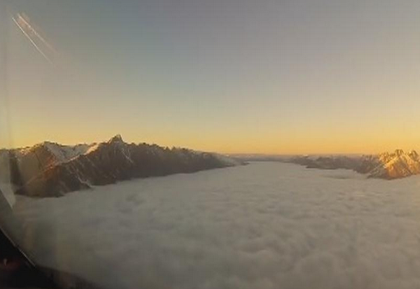 На снимката се гледа како авионот лета над облаците опкружен со врвови на планината. Во еден момент авионот почнува да се спушта, а врвот на една планина се наоѓа веднаш пред него. Неколку секунди лета низ маглата за наредниот момент да помине низ