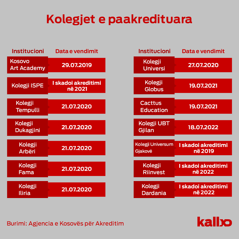 Четиринаесет колеџи и други високообразовни институции во Косово ги загубиле акредитациите во последните четири години и веќе не биле акредитирани од страна на Косовската агенција за акредитација, пренесуваат тамошните медиуми.
