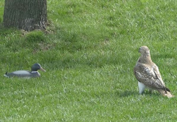 Така, на пример, овој јастреб беше многу збунет околу „патката“ што ја виде, која всушност не беше жива патка, туку украс за тревник. Јастребот помисли дека си најде вкусна вечера, но се збуни затоа што патката не реагираше никако на неговите закани. Така, тој почна да покажува јасни знаци на сомнеж и конфузија. Одеднаш оди до патката и ја напаѓа, и тоа го прави неколку пати. Сето тоа трае 2 минути, повремено движејќи се или напаѓајќи ја пластичната патка, па можете да забележите дека е целосно збунет затоа што патката не се движи и не реагира на никаков начин.