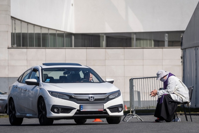 Полскиот свештеник Матеус Кјеларски смислил „драјв-ин“ исповедување на паркинг на црква во Варшава и на тој начин им овозможил на верниците да бараат прошка за гревовите пред големиот празник. Свештеникот, заштитен со хируршка маска, седи на стол на паркингот и ги слуша верниците кои седат во нивниот автомобил и се исповедаат преку отворен прозорец.