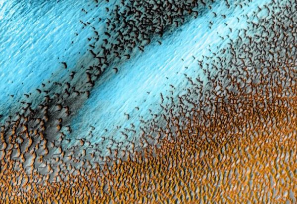 Во четвртокот НАСА објави неверојатна фотографија од море од дини на Марс. Фотографијата прикажува и извајани линии од ветер што ја опкружуваат замрзнатата северна поларна капа на Марс.