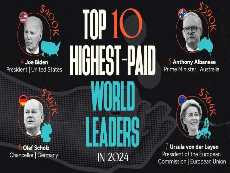Интересно, на седмото место со плата од 364.000 долари е германската политичарка Урсула фон дер Лајен, која не е лидер на земја. Таа е 13. претседателка на Европската комисија, извршната власт на Европската Унија, назначена во декември 2019 година.