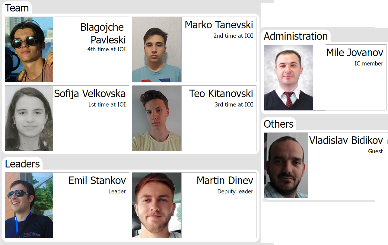 Нашиот тим традиционално се избира во целогодишен циклус натпревари кој го организира Здружението на информатичарите на Македонија (ЗИМ), годинава поддржан од Факултетот за информатички науки и компјутерско инженерство (ФИНКИ) и општествено одговорните компании Мелон Технологии, Нетцетера и Семос Едукација. Натпреварите се одржуваат преку системот mendo.mk кој е одржуван волонтерски од ЗИМ и е достапен во текот на целта година за сите заинтересирани натпреварувачи.