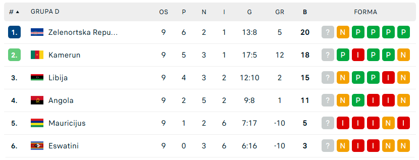 Едно коло пред крајот Зелен 'Рт има два поени повеќе од второпласираниот Камерун и победата сигурно го води на Мундијалот. Дури и во случај на неуспех, многу е веројатно дека ќе оди понатаму преку споредување на најдобро второпласираните.