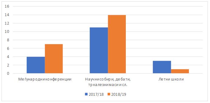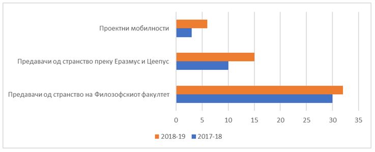 Вкупно гостувале 146 професори од странство, а 150 професори од Филозофски биле на 98 на меѓународни конференции, 18 предавања на странски универзитети, 13 проектни посети, 4 предавања на европски универзитети и 17 мобилности заради иницијативи за заеднички меѓународни наставно-научни активности