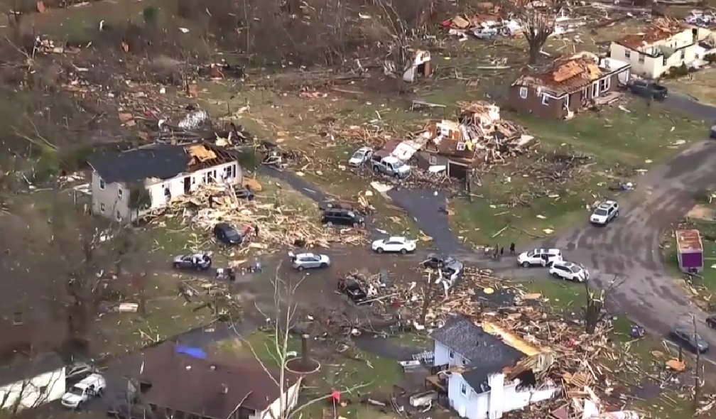 Торнадото што го погоди Кентаки било најсмртоносното досега во државата, изјавиле од власта. Видео објавено на Би-би-си ја покажува штетата.