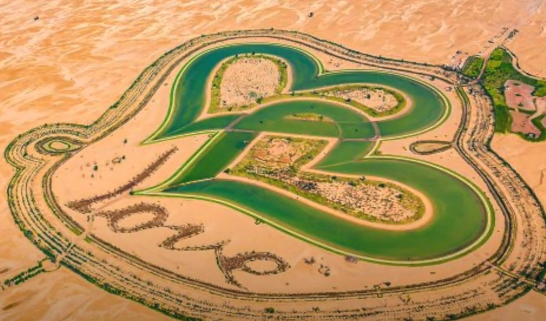 Дубаи не може да ве остави рамнодушни. Од облакодери до вештачки остров, овој град изобилува со неверојатни градби. Еден таков проект на градот е вештачко езеро на љубовта кое е во облик на две испреплетени срциња.