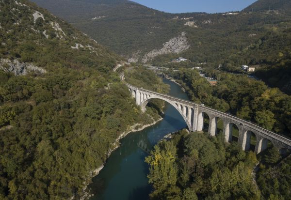 - Една од најстарите словенечки железнички маршрути вклучува 28 тунели и 65 моста, вклучувајќи го и Солканскиот мост, најголемиот камен железнички мост во светот, кој ги поврзува двата брега на реката Соча - пишува Си-ен-ен.