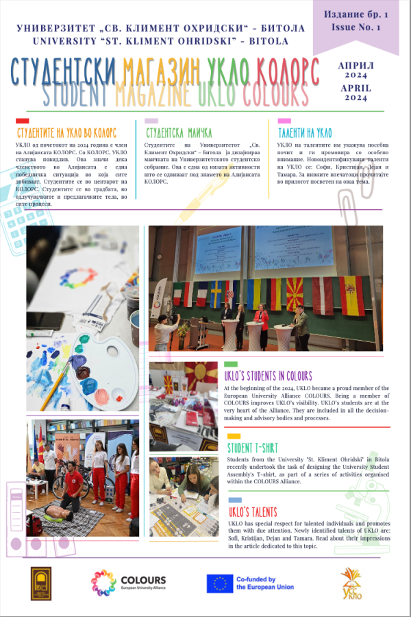 Овој продукт, прв од свој вид, па и на ниво на Aлијансата, е првиот двојазичен студентски магазин УКЛО КОЛОРС! Низ 40-ина страници жуборат боите на многубројни активности, настани, креации и кокреации, изразени низ призмата на младиот интелект.