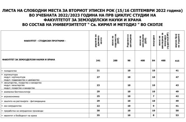 Факултетот за земјоделски науки и храна при Универзитетот „Св. Кирил и Методиј“ во Скопје ја објави листата со слободни места за вториот уписен рок, за учебната 2022/2023 година, на прв циклус студии.