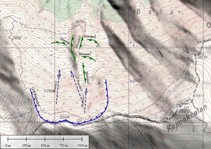 Гребенот на циркот е на височина од 2.200 до 2.334 метри, додека циркниот под, кој е доста зарамнет, е на околу 2.000 метри. На неговото дно има мало мочуриште-тресетиште со пречник од 100 метри, кое очигледно е остаток од поранешно глацијално езеро. Со теренските опсервации и анализа на дронските снимки направени во таа пригода, утврдена е серија на челни и странични морени на височина од 1.800 до 2.050 метри, која укажува на фазно повлекување на глечерот кон повисоките делови со затоплување на климата при крајот на плеистоценот. Според направената реконструкција, должината на глечерот била околу 1,5 километар, во правец кон север-североисток. Тоа што циркот (цирковите) не е толку јасно релјефно изразен е резултат на слабо отпорната геолошка подлога во која е всечен (претежно микашисти), за разлика од цирковите на другите високи планини, кои главно се всечени во варовници (Јабланица, Шара, Бистра), мермери (Јакупица), гранити (Пелистер) и сл. Покрај глацијални форми, на овој простор има маркантни периглацијални појави, особено тревни (солифлукциски) тераси, лизгачки блокови, нивациски циркови и др.