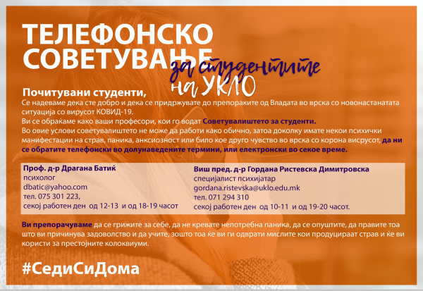 Стручниот тим на УКЛО од психолошкото советувалиште со особена грижа и посветеност, во континуитет ги подобрува пристапите и начините за зачувување и негување на менталното здравје, нагласувајќи: „Оваа ситуација е кризна од повеќе причини: постои можност да се разболиме ние или нашите блиски, ни се прекина животната рутина (секојдневните обврски), ни се прекинуваат физичките контакти и мораме да седиме дома. Ваквата ситуација е нова за сите нас и вклучува неизвесност која може да создаде чувство на анксиозност, страв, паника. Во тие моменти добро е студентите да имаат психолошка поддршка, да се обратат до стручно лице (психолог, психијатар). Со оглед на тоа што советувалиште за студенти веќе постои, сметавме дека и во овие услови треба да продолжиме во согласност со сегашната ситуација. Сакаме да ги поттикнеме студентите да се грижат за себе, да не се заплашуваат себеси така што ќе читаат неселективно и ќе ги впиваат сите информации (потребни и непотребни) што само ја зголемува паниката, да се опуштат, да вежбаат, да прават нешто што им причинува задоволство и да учат, бидејќи тоа ќе им ги одврати мислите што продуцираат страв. Во оваа ситуација е неопходно да се биде активен, затоа што активноста и структурираното време ќе го намалат стресот. Стресот во овие околности е всушност „нормална реакција на ненормална ситуација“, така што кога е во прашање коронавирусот, не можеме да го исклучиме, но затоа можеме да го контролираме. За тоа постојат многу начини, техники на длабока релаксација, вежбање, дишење и сл. Битно е стресот да се препознае и да се контролира. Значајно е студентите да знаат дека не се сами, дека ние, и како професионалци за ментално здравје и како нивни професори, сме тука да им дадеме поддршка и да ги охрабриме за полесно да ја надвладеат оваа ситуација“.