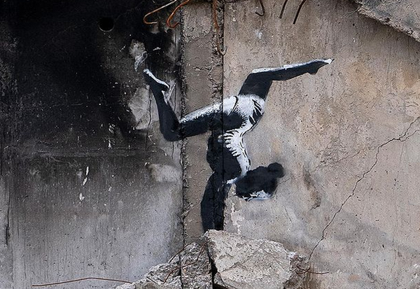 Бенкси објави слика на неговиот инстаграм-профил од уметничкото дело во кое гимнастичарка прави стој на раце среде остатоците од урнатата зграда во Бородјанка, Украина.