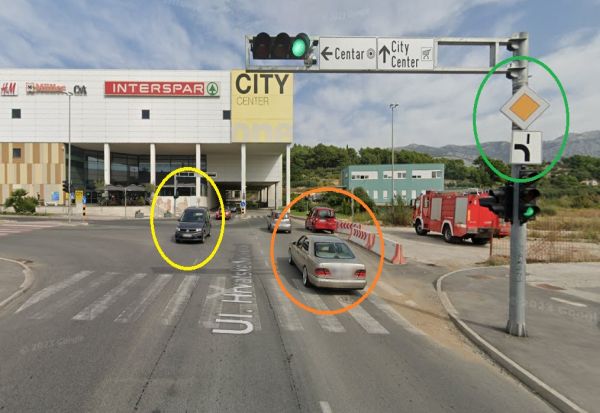 - Прво, семафор има на двете страни. Очигледно дека и едната и другата насока имаат зелено. Овој во портокаловиот круг оди право бидејќи ако одеше лево, требаше да биде престроен во левата лента. Ако врти лево, тогаш треба да го пропушти оној што доаѓа од центарот. Ако не работат семафорите, тогаш тој што оди лево има предност на главниот пат бидејќи од центарот има триаголник - е друг коментар.