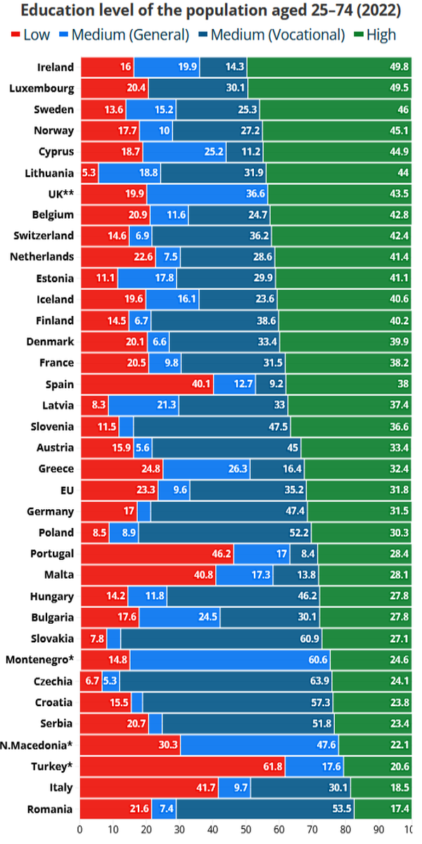 Во 2022 година, 31,8 отсто од луѓето на возраст од 25 до 74 години во ЕУ имале повисоко образовно достигнување, кое се движи од 17,4 отсто во Романија до 49,8 отсто во Ирска.