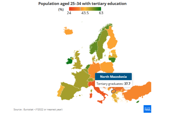 Во Македонија, 30,3 отсто од луѓето на возраст од 25 до 74 години имаат ниско образование, 47,6 средно и 22,1 отсто високо образование поради што се наоѓа на 34. место од вкупно 37. места.
