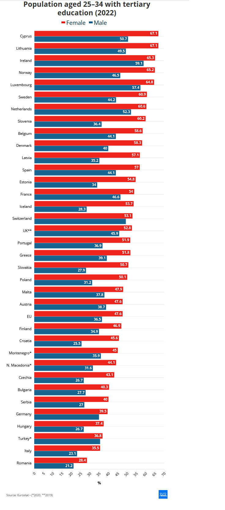 Во 35 европски земји каде што се достапни податоци, жените на возраст од 25 до 34 години имале повисок процент на постигнување високо образование од мажите.