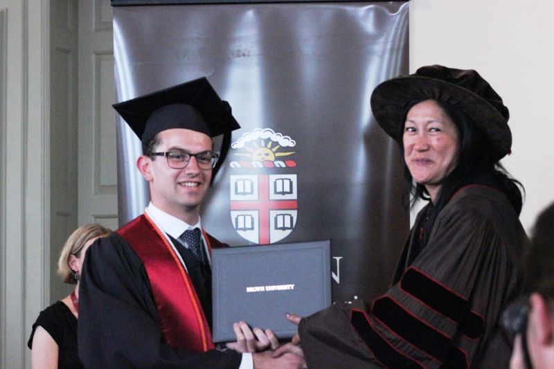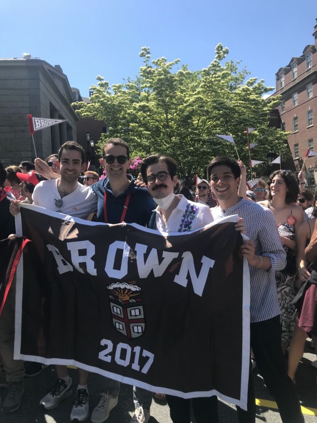 Филип со другари од Бугарија, Турција и Филипините го носат знамето на нивната генерација за време на процесијата на алумни на универзитетот „Браун“