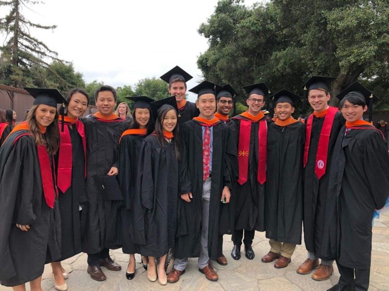 Филип со другари од програмата за машинско инженерство пред доделување на нивните магистерски дипломи на универзитетот „Стенфорд“