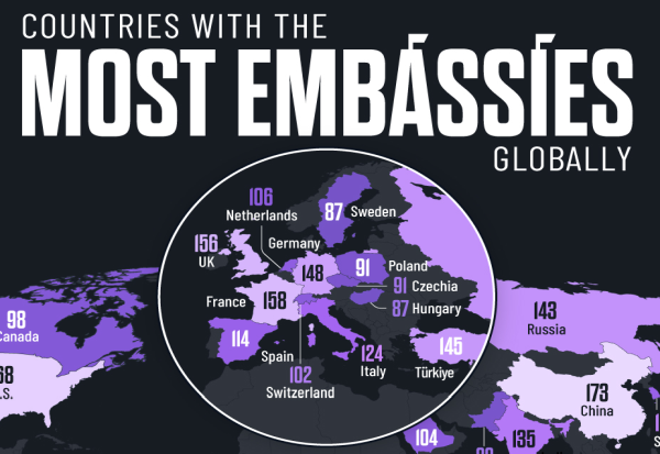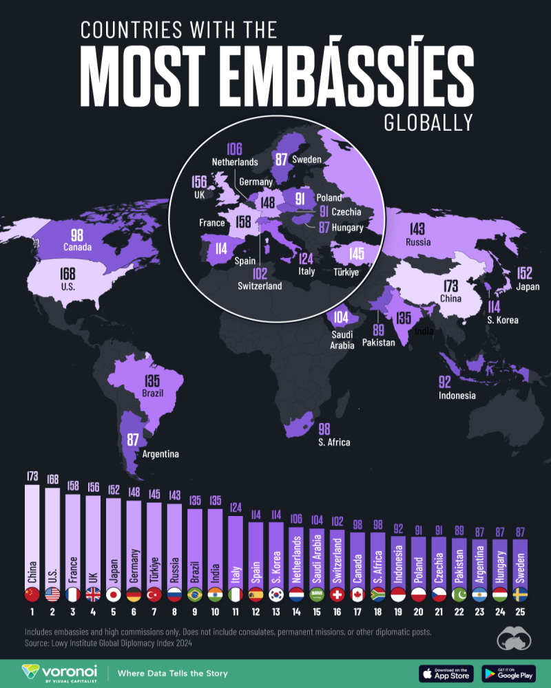 Кина води со 173 амбасади во светот, засенувајќи ги САД, кои имаат 168. Поранешните колонијални сили Франција и Велика Британија се рангирани на четврто и петто место, а петорката ја заокружува Јапонија.