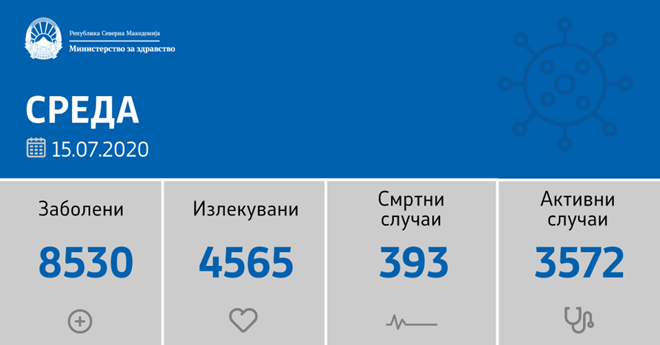 Вкупната бројка на ковид - дијагностицирани во нашата земја од почетокот на епидемијата изнесува 8.530, бројката на оздравени пациенти е 4.565, на починати е 393, а во моментов бројот на активни случаи во земјата изнесува 3.572.