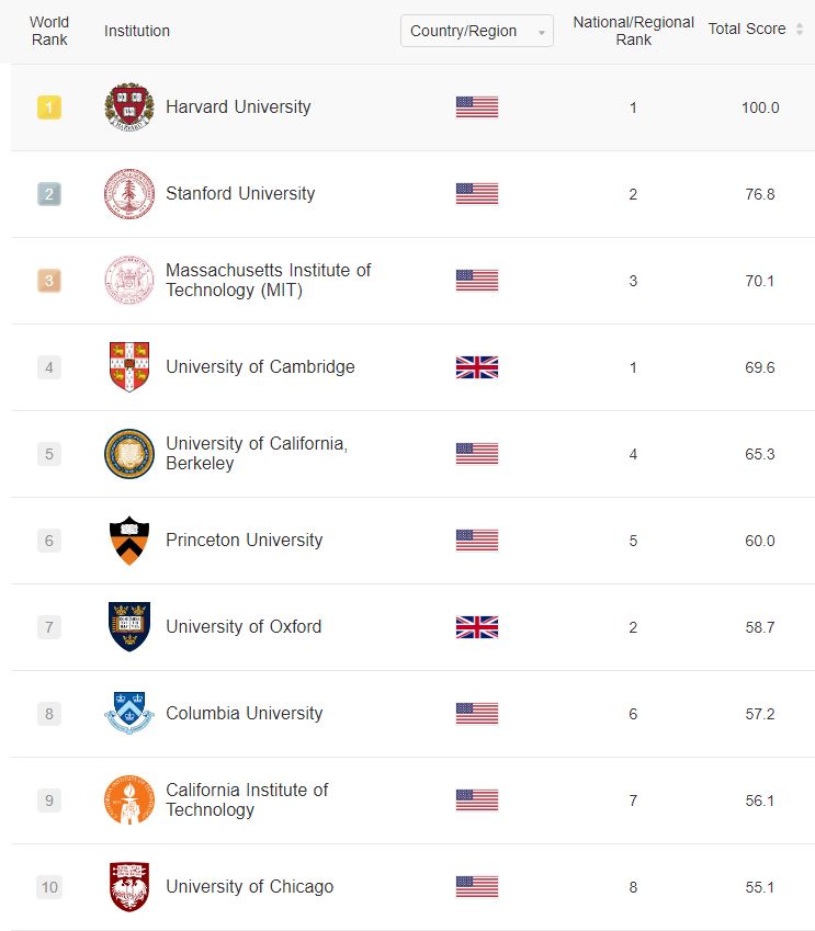 На првото место се наоѓа американскиот универзитет „Харвард“, на второто британскиот „Кембриџ“, а на третото Технолошкиот институт во Масачусетс, попознат како МИТ.