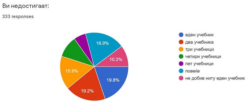 По еден учебник им недостига на 19,8 отсто од анкетираните читатели. Вкупно 19,2 испитаници одговориле дека им фалат два учебника, 15,9 отсто рекле дека им недостигаат три учебници, на 10,2 отсто им недостигаат четири учебници, на 5,7 отсто им фалат по пет учебници, на 18,9 отсто одговориле дека им недостигаат повеќе од пет. Вкупно 10,2 отсто, односно 34 читатели одговориле дека не добиле ниту еден учебник.