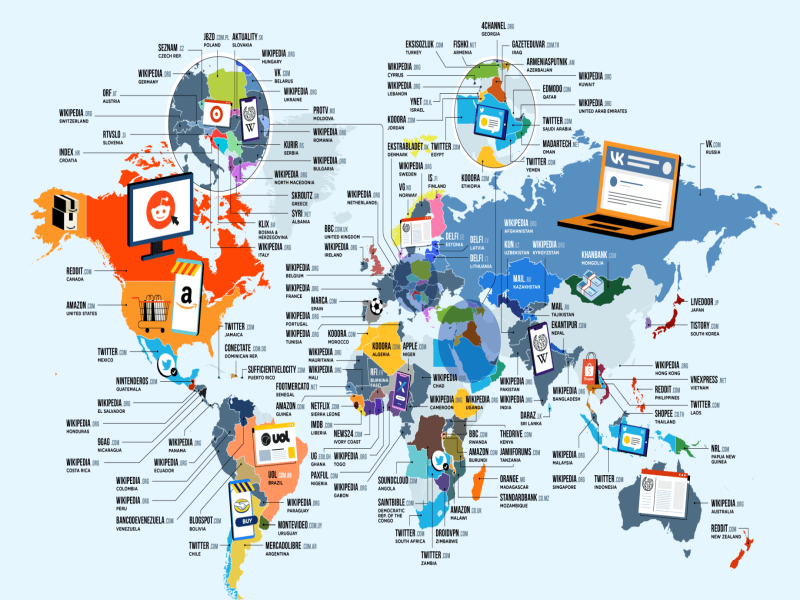 Тимот на „Хостингер“ создаде графикон што ги прикажува најпосетуваните веб-страници во земјите низ светот, рангирајќи ги податоците од извештајот на „Семрус опен трендс“ објавен минатиот месец. Нивната анализа не ги вклучува „Фејсбук“, „Јутјуб“ или пребарувачите, бидејќи тие би ја преплавиле мапата. Без овие веб-адреси, „Википедија“ е најпосетуваната веб-страница генерално, доминирајќи во 41 земја вклучувајќи ги Франција, Индија и Австралија.