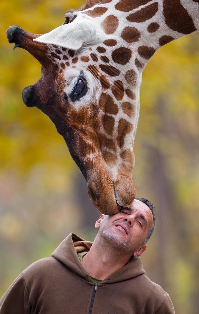 Овој чувар во скопската Зоолошката градина изградил посебен однос со жирафите за кои се грижи. Тие се толку приврзани за него што постојано трчаат по него.