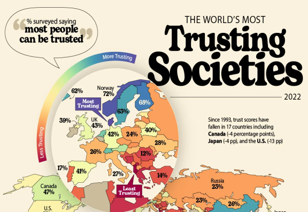 Инфографиконот на „Visual capitalist“ рангира 90 држави според процентот на возрасни кои се согласуваат со изјавата: „На најголемиот дел од луѓето може да им се верува“.