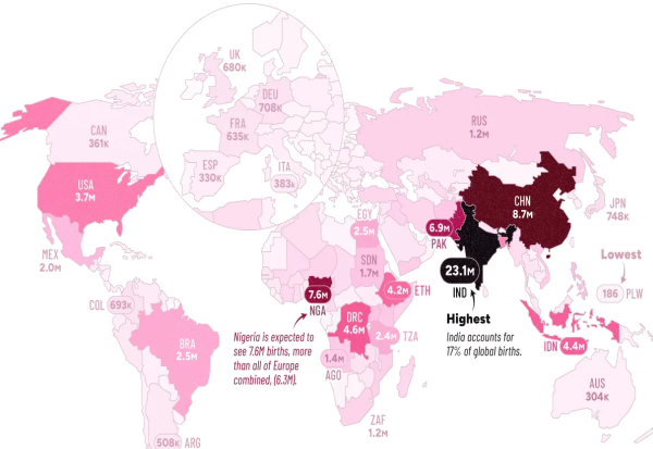 Следуваат Пакистан со околу 6,9 милиони, Демократската Република Конго со 4,5 милиони, Индонезија со 4,4 милиони, Етиопија со 4,1 милиони, САД со 3,6 милиони, Бангладеш со 3,4 милиони и Бразил со 2,5 милиони раѓања. Во 2025 година Европа се соочи со длабока криза на плодност, со вкупно 6,3 милиони раѓања, што покажува контраст со земјите со највисоки стапки на раѓања.