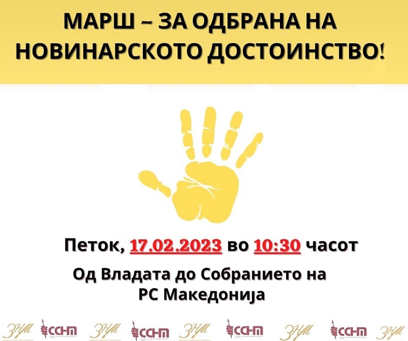 Здружението на новинари на Македонија и Самостојниот синдикат на новинари и медиумски работници ги повикаа сите медиумски професионалци утре да излезат на протестен марш, на кој ќе го изразат, како што велат, незадоволството од нападите врз новинарите, навредите и понижувањата од политичарите, нелојалната конкуренција, небезбедните услови во кои работат новинарите, лошата социо-економска состојба.