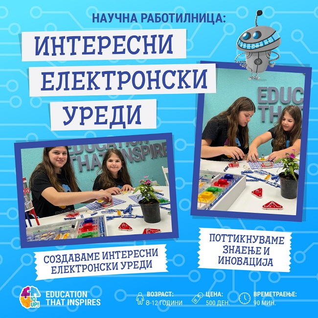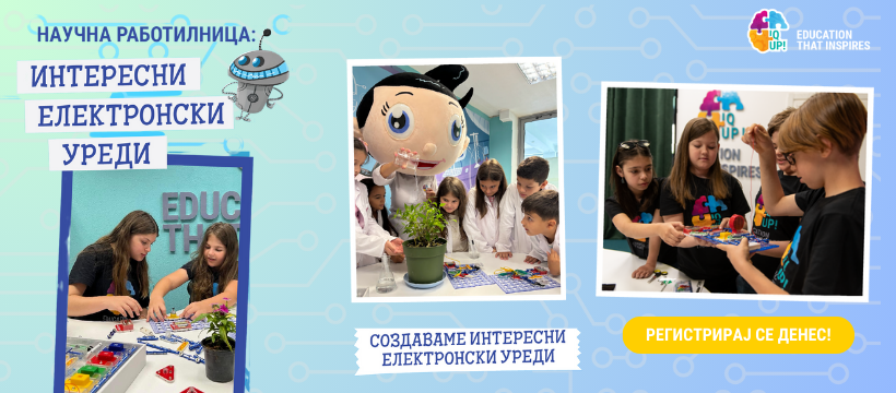 IQ UP! училишните центри за иновативна СТЕМ-едукација за деца низ државата организираат интерактивна СТЕМ-работилница „Забавна електроника“, наменета за деца од 8 до 12 години, токму за млади љубопитни умови како вашето дете.