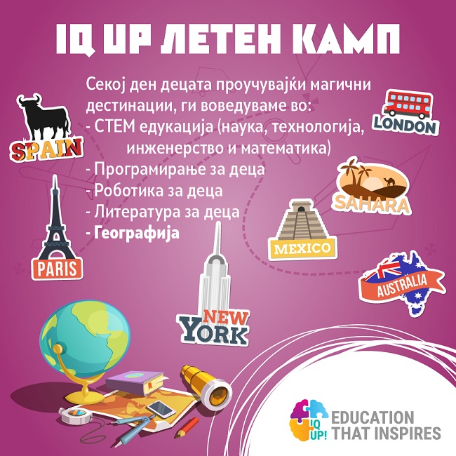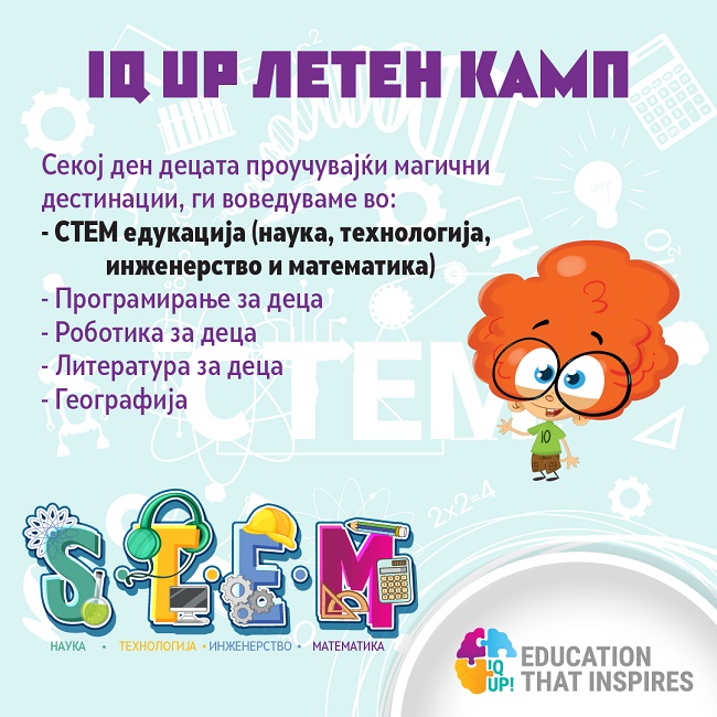 IQ UP! ви нуди уникатен 10-дневен летен камп за деца од 5 до 10 години, со мултидисциплинарна програма во која се интегрирани сите области од СТЕМ-едукацијата, со литература, географија, програмирање и роботика за деца.
