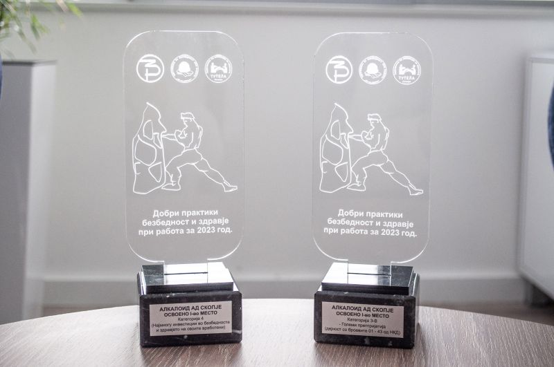 - Добиените признанија се најдобар доказ за напорите што ги вложува „Алкалоид“ во градењето безбедна и здрава работна средина. Ова за нас претставува мотив повеќе и во иднина да продолжиме со напорна работа и со надминување на предизвиците преку континуирано унапредување на воспоставениот систем за безбедност и здравје при работа и преку примена на светски етаблираните практики, кои се со цел заштита на вработените - истакна Ицев.
